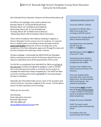 Please keep Coach Koranda informed of emergencies or situations that would cause the student to be absent on any day. Please avoid planning a vacation during the scheduled dates of classroom instruction. Absence during the bulk of the classroom instruction would make the possibility of passing the course nearly impossible and therefore be a waste of the student’s time and the parent/guardian’s finances.