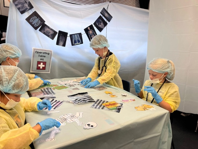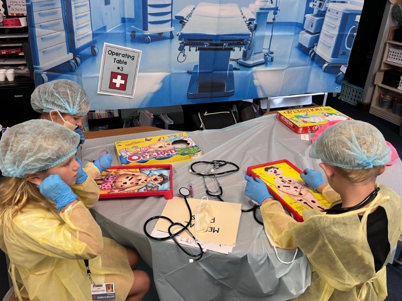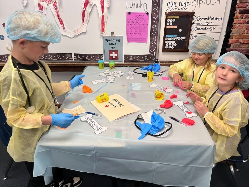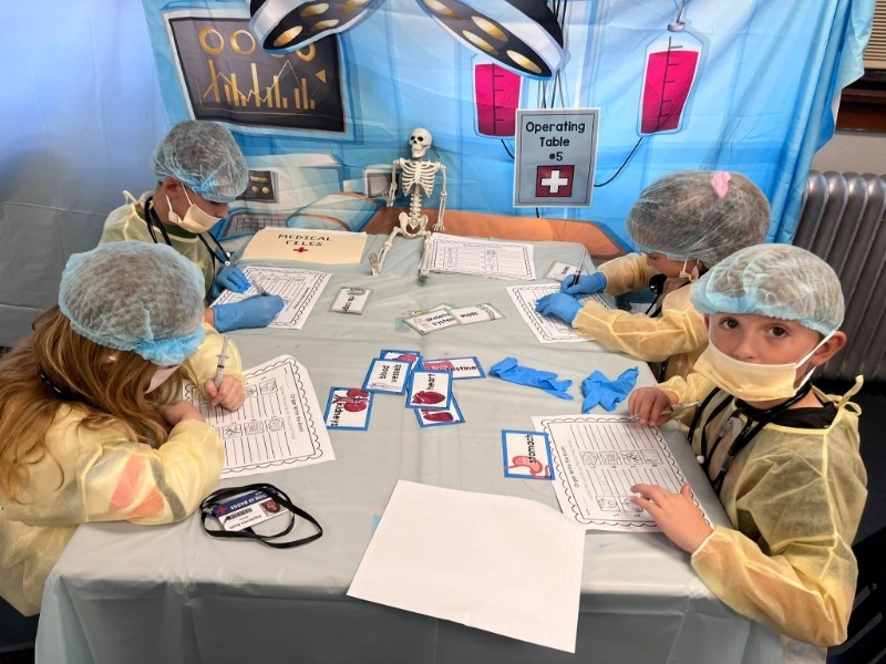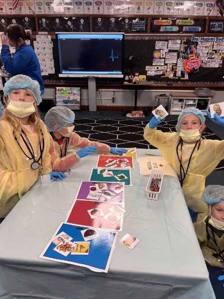 The last few weeks the first graders have been learning all about the human body. They learned about 5 systems (skeletal, muscular, circulatory, nervous, digestive), germs, 5 key ways to stay healthy, and the food pyramid. They ended their unit with “Doctor Day” to put what they learned into practice!