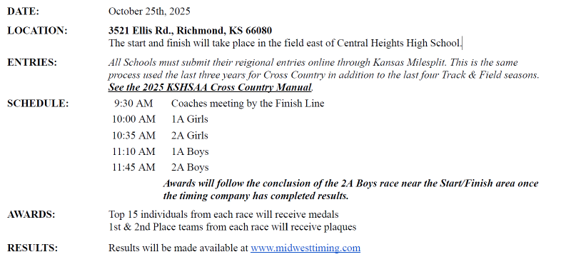 Regional Cross Country Information. Regional Cross Country will be hosted at Richmond-Central Heights. Girls will run at 10 AM and boys at approx. 11:10 AM. Good luck Trojans!