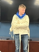 Pic 2: Sophomore Riley Grable tries on the straitjacket.