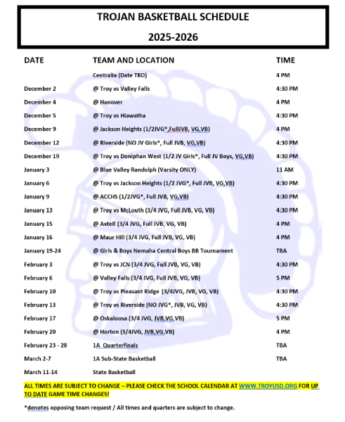 The 2025-2026 HS Basketball schedule has been updated. A few notes: We are aware this updated schedule does NOT match the printed master calendar that is done in August. When that calendar goes to print in early August we don't know how many athletes will be out for each team we play so in early December changes are made to the schedule to accommodate teams that may not have enough for JV, etc. This does then change start times. With that being said, the schedule could still change possibly with sickness, injuries, inclement weather, etc. So please check the school calendar on our website for updates. Thank you.