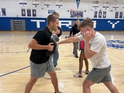 Pic 2: Hunter Engemann perfects his self-defense form while Caden Rosenberger holds a bag.